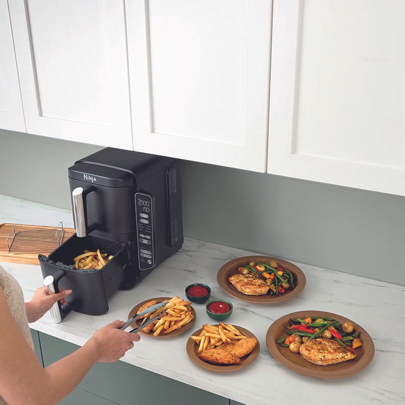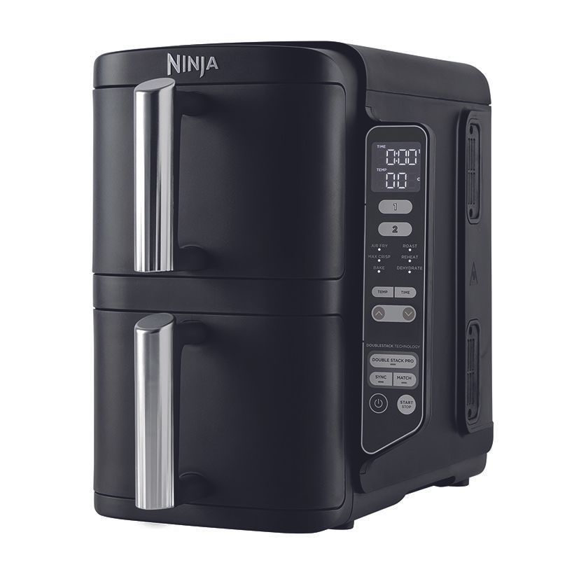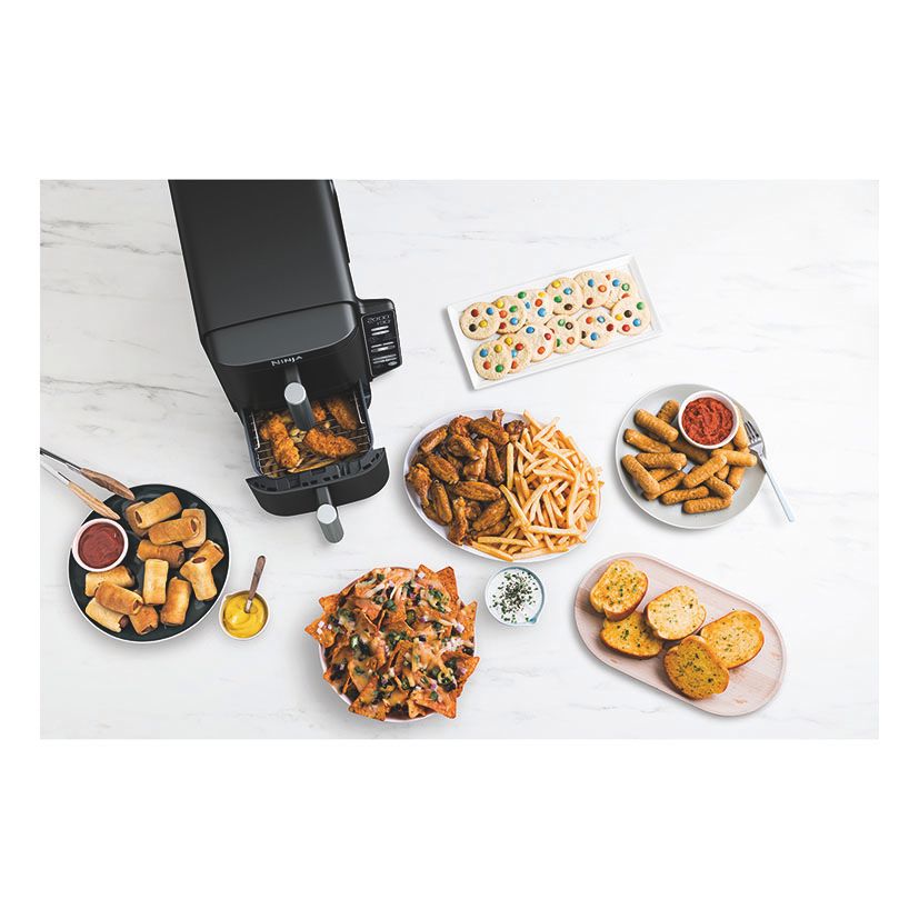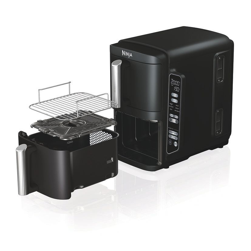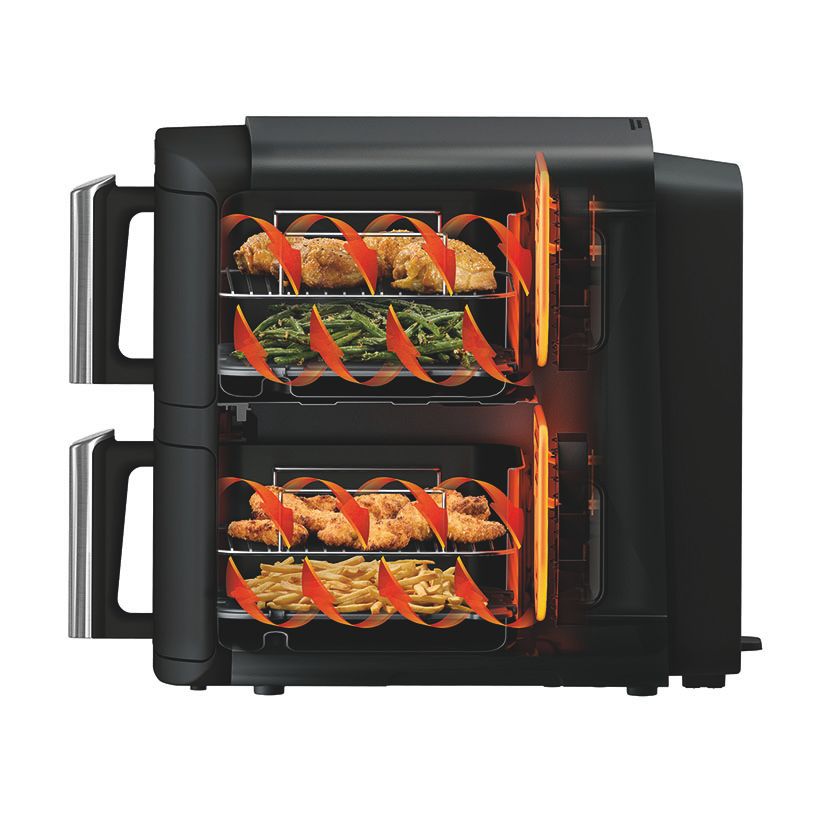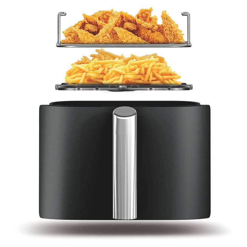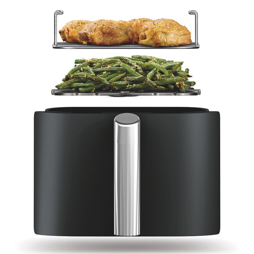 2 cajones superpuestos (7,6 l). Incluye 2 rejillas elevadas: cocina uniformemente hasta 4 capas de alimentos.