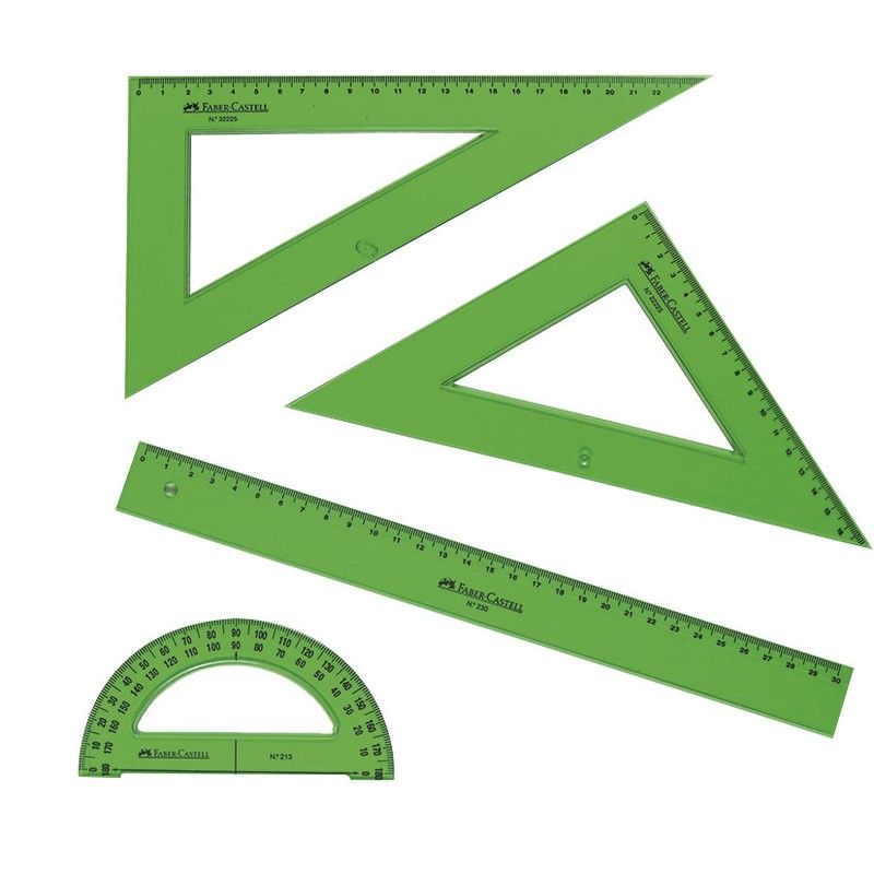 Piezas en plástico inyectado verde transparente con graduaciones grabadas a prueba de emborronamiento. Funda de plástico protector.