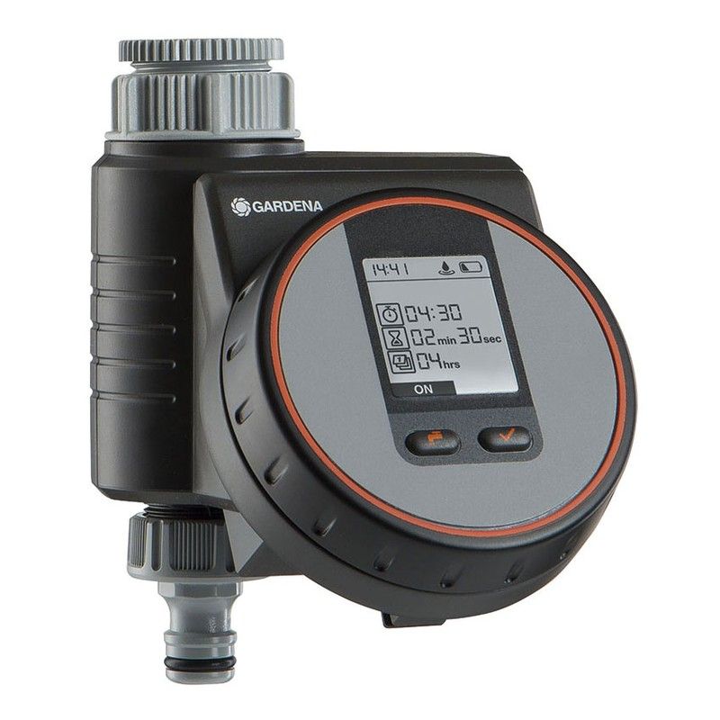 Se inicia con un rotador externo para la selección de datos y un botón de confirmación. Función \"regar ahora\". Tecnología de parada segura. Pantalla LCD. Periodos ajustables en ciclos de segundos. Funciona con 1 pila alcalina de 9 V (no incluida)..