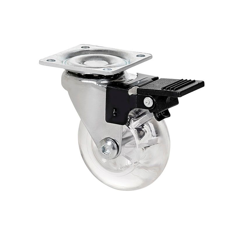 Rueda transparente centro policarbonato. Bandeja poliuretano. Tipo soporte giratorio. Tipo fijación platina. Cojinete liso. Recomendada para interiores. Modelo 1-0660, Con freno. ø 50 mm. Carga máx. 40 kg.