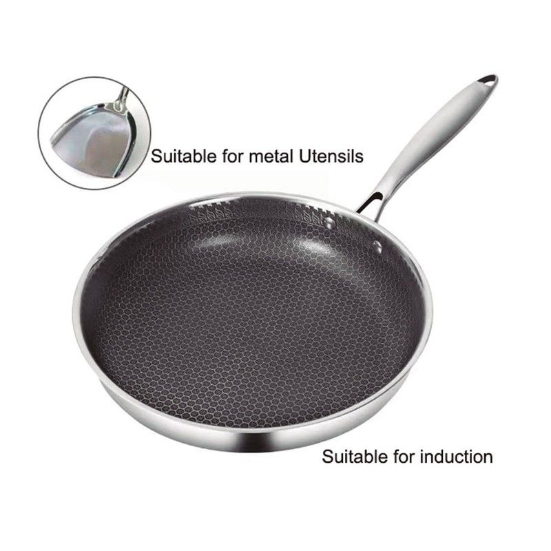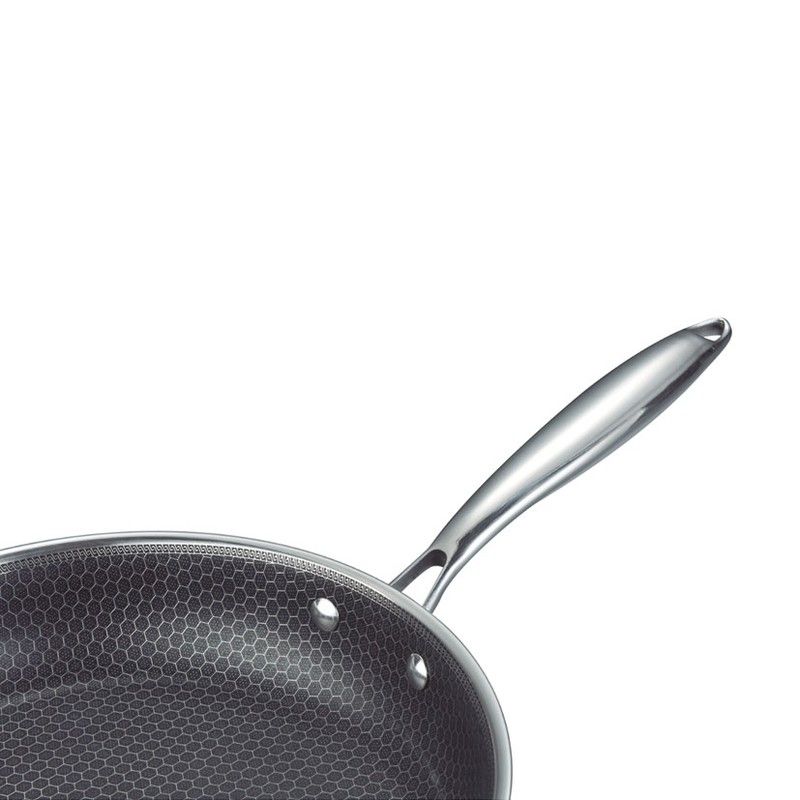 Acero inox Tri-ply: triple cuerpo: acero + aluminio + acero. 2,5 mm. espesor. Antiadherente de 3 capas libre PFOA acabado en nido de abeja. Mango ergonómico de acero inox, remachado profesional y tacto frío. Fondo difusor con base ferrítica \"full induction\" para todo tipo de cocinas.