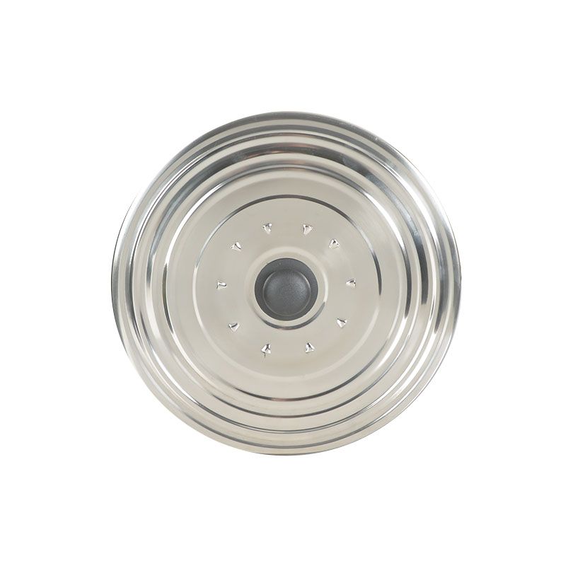 Acero inox. Con agujeros para salida de vapor. Pomo de baquelita aislante del calor.